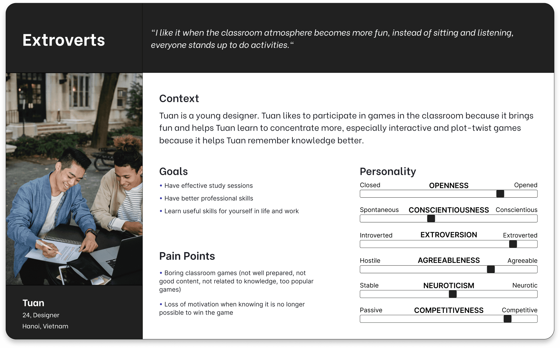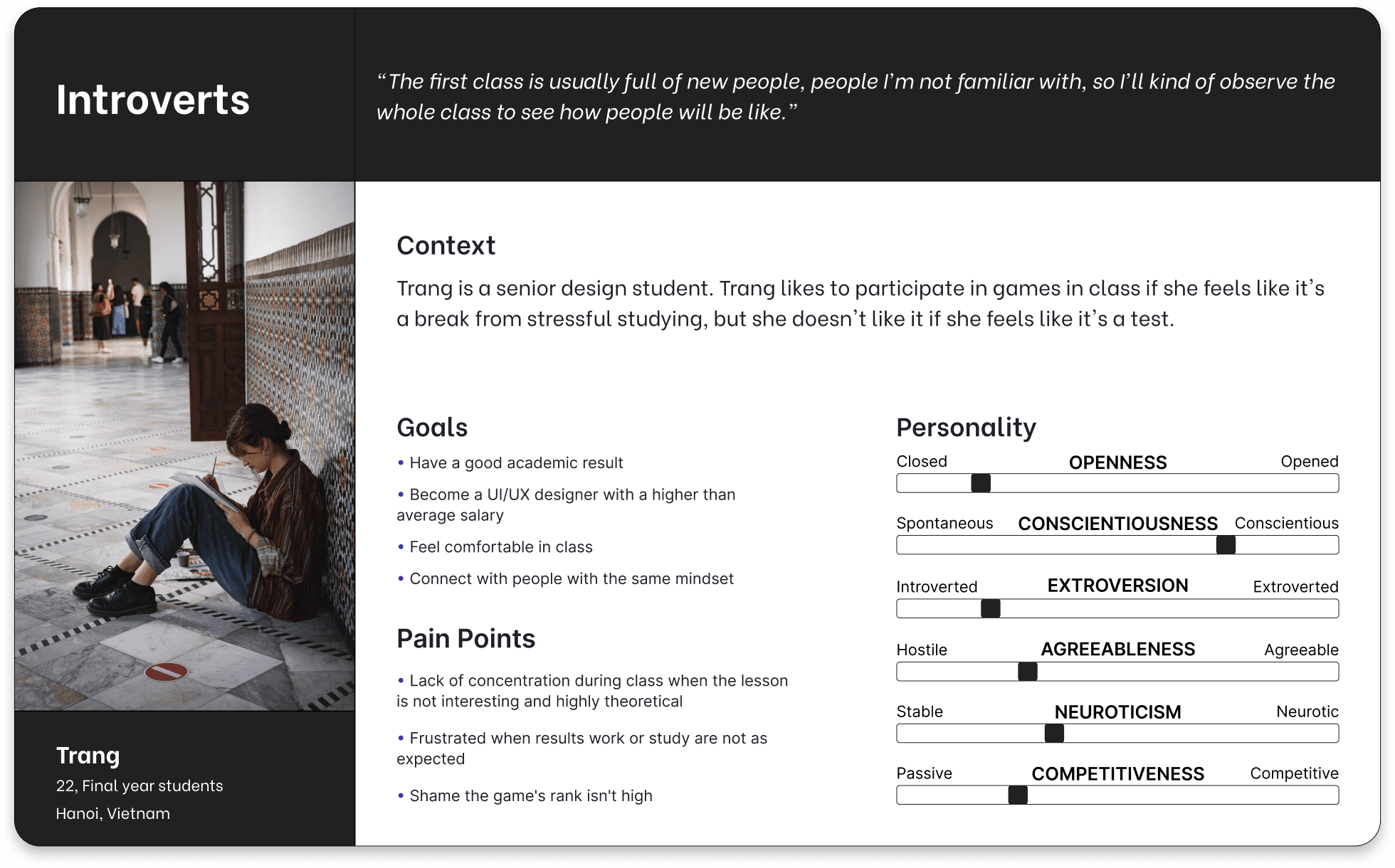 After analysis and empathy with the users my team interviewed, my teammates and I decided to divide the group of UXF students into two groups: Introverts and Extroverts.