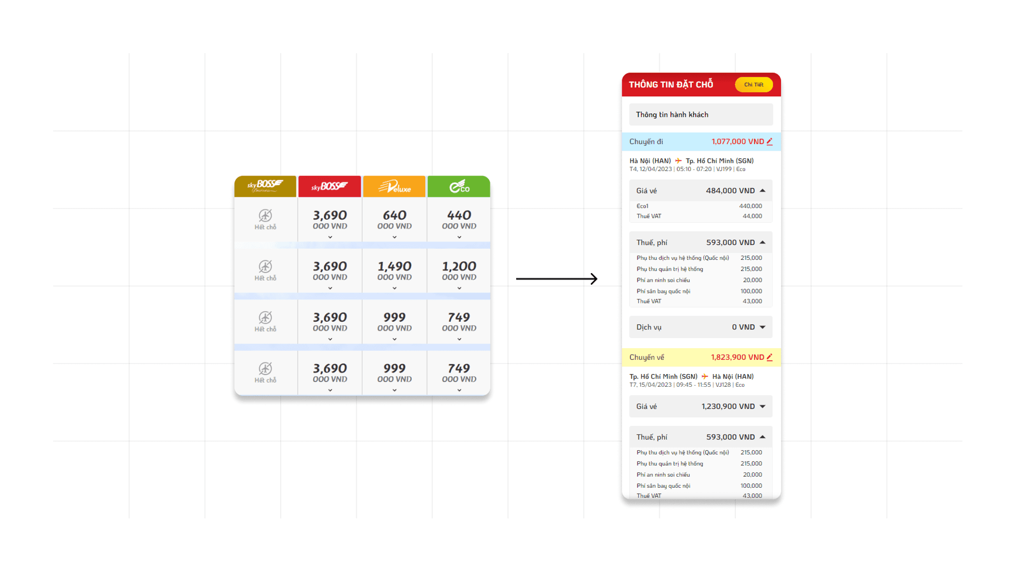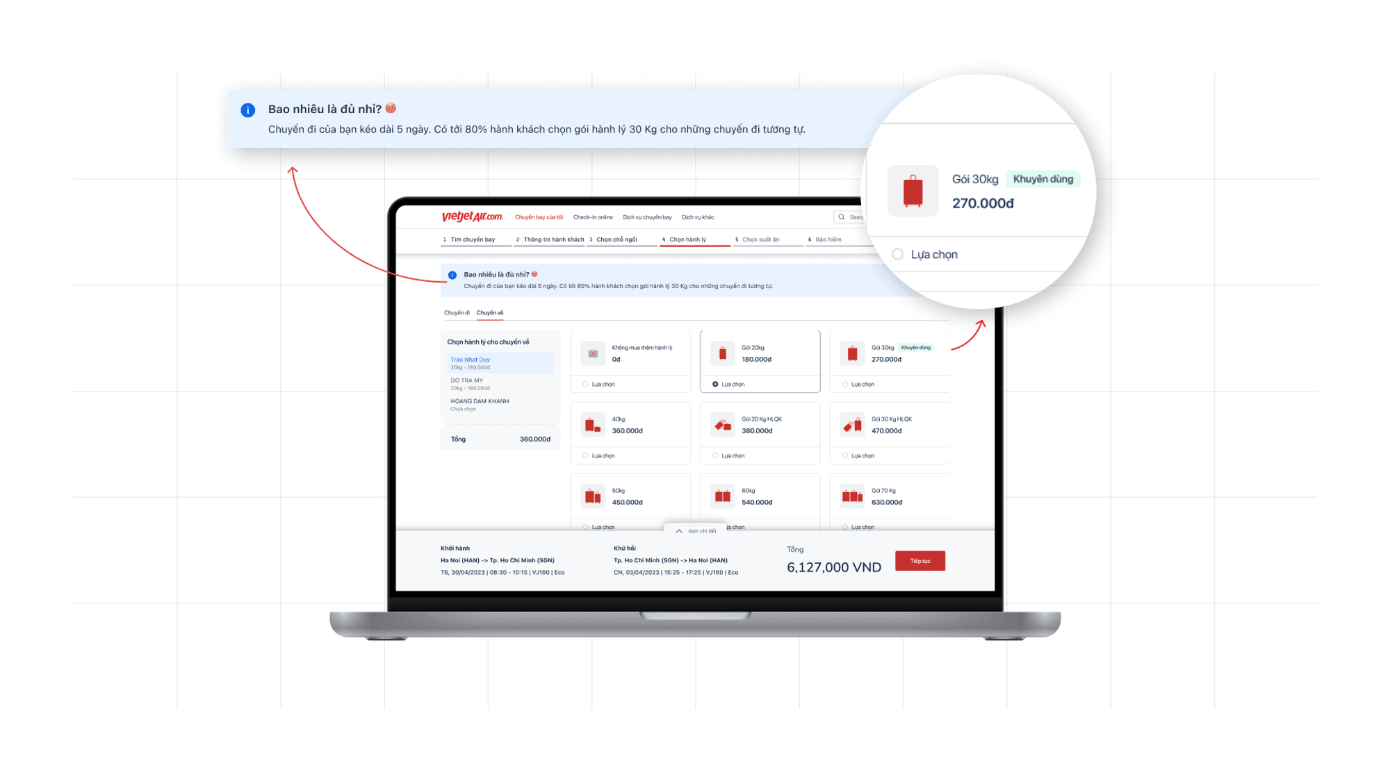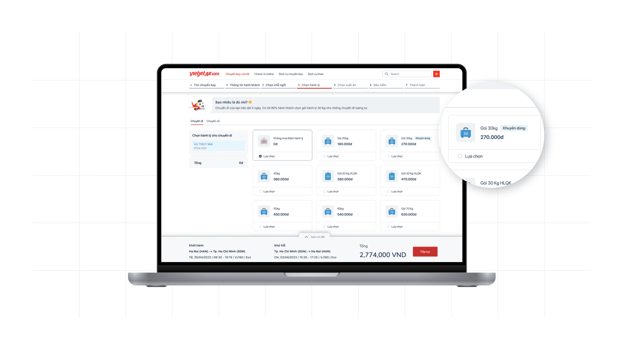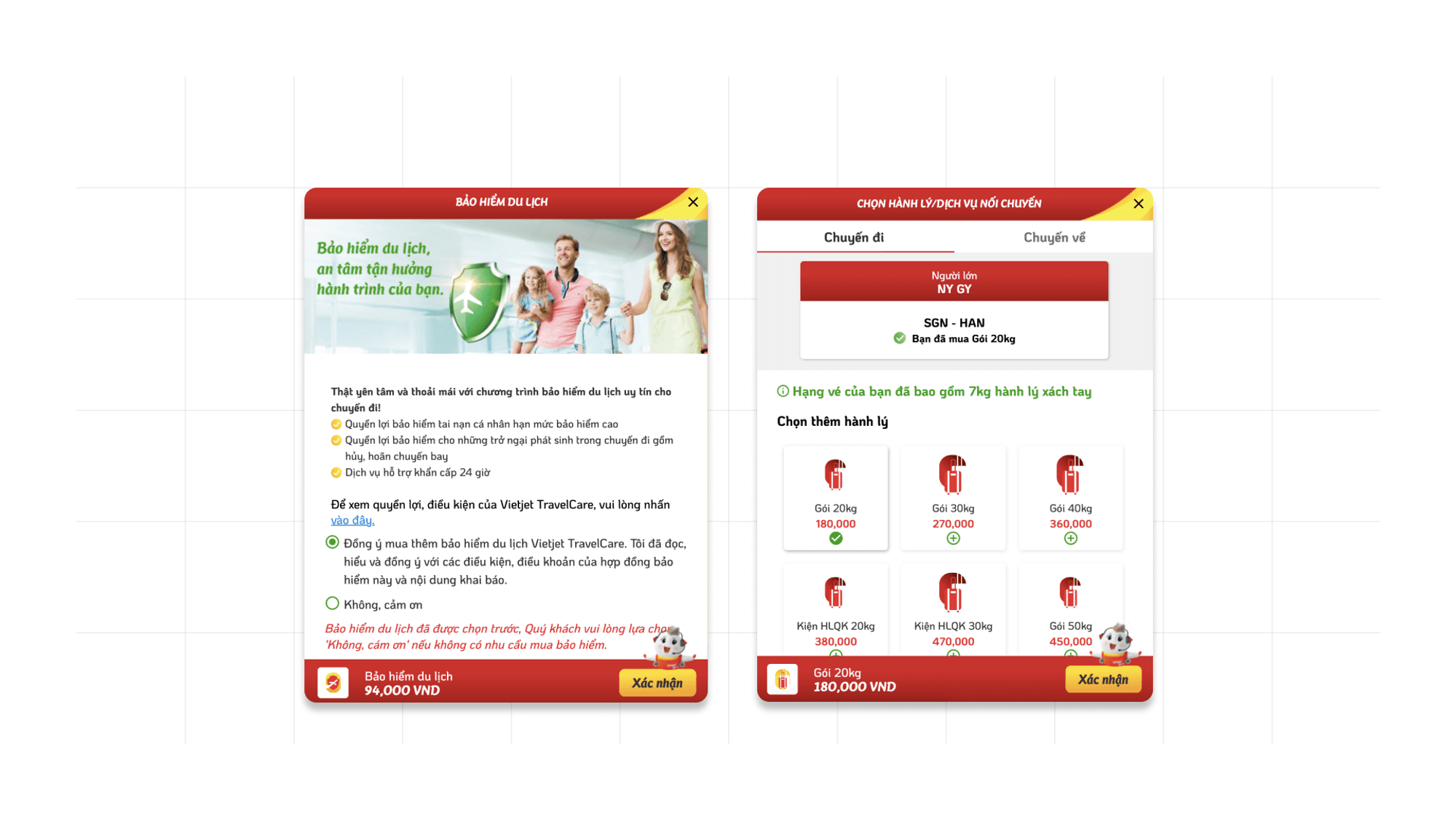 We make a major tweak to the flow, to sell more services, instead of just letting the user choose which service suits them, we walk them through all the service purchase screens of Vietjet Air for promotion opportunities. Of course, we still allow user to Skip through.