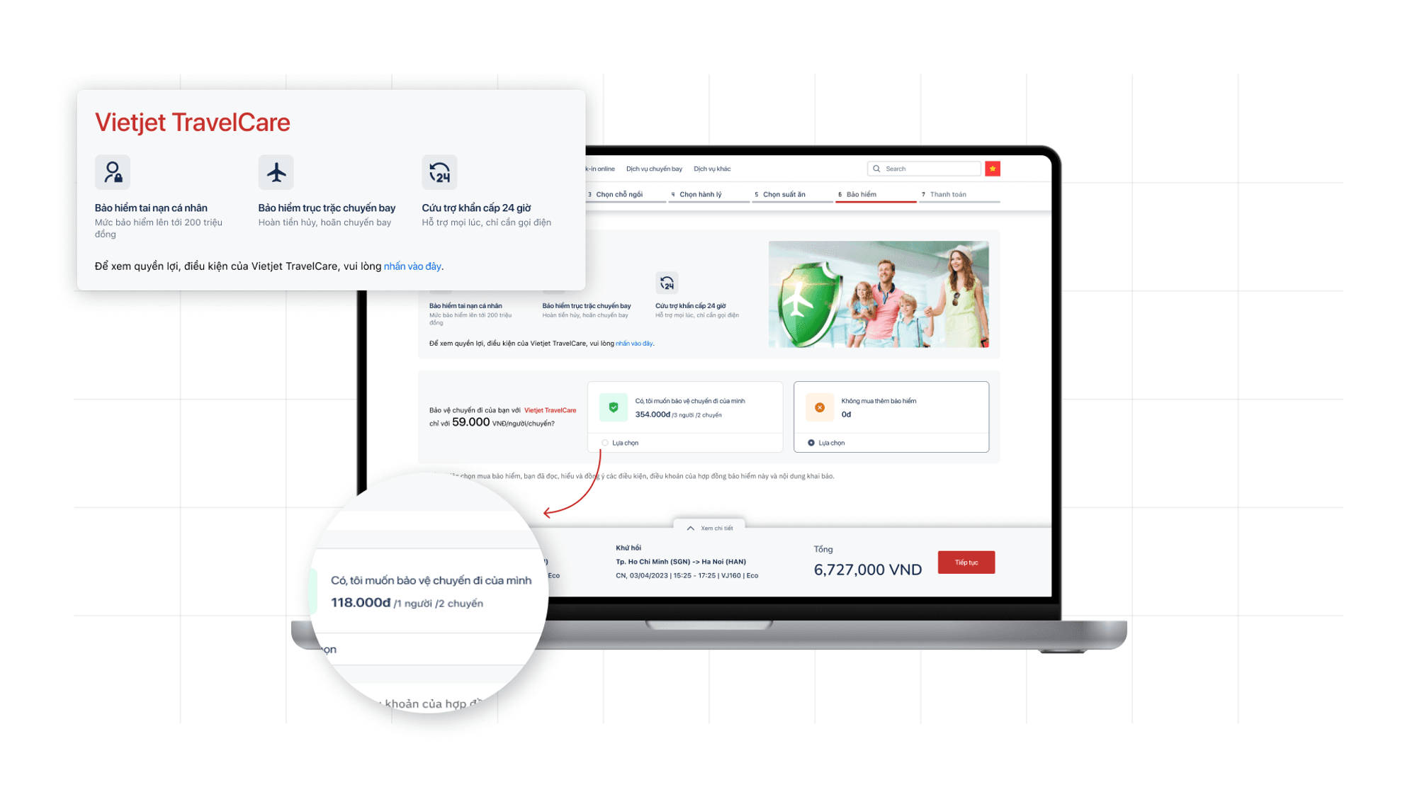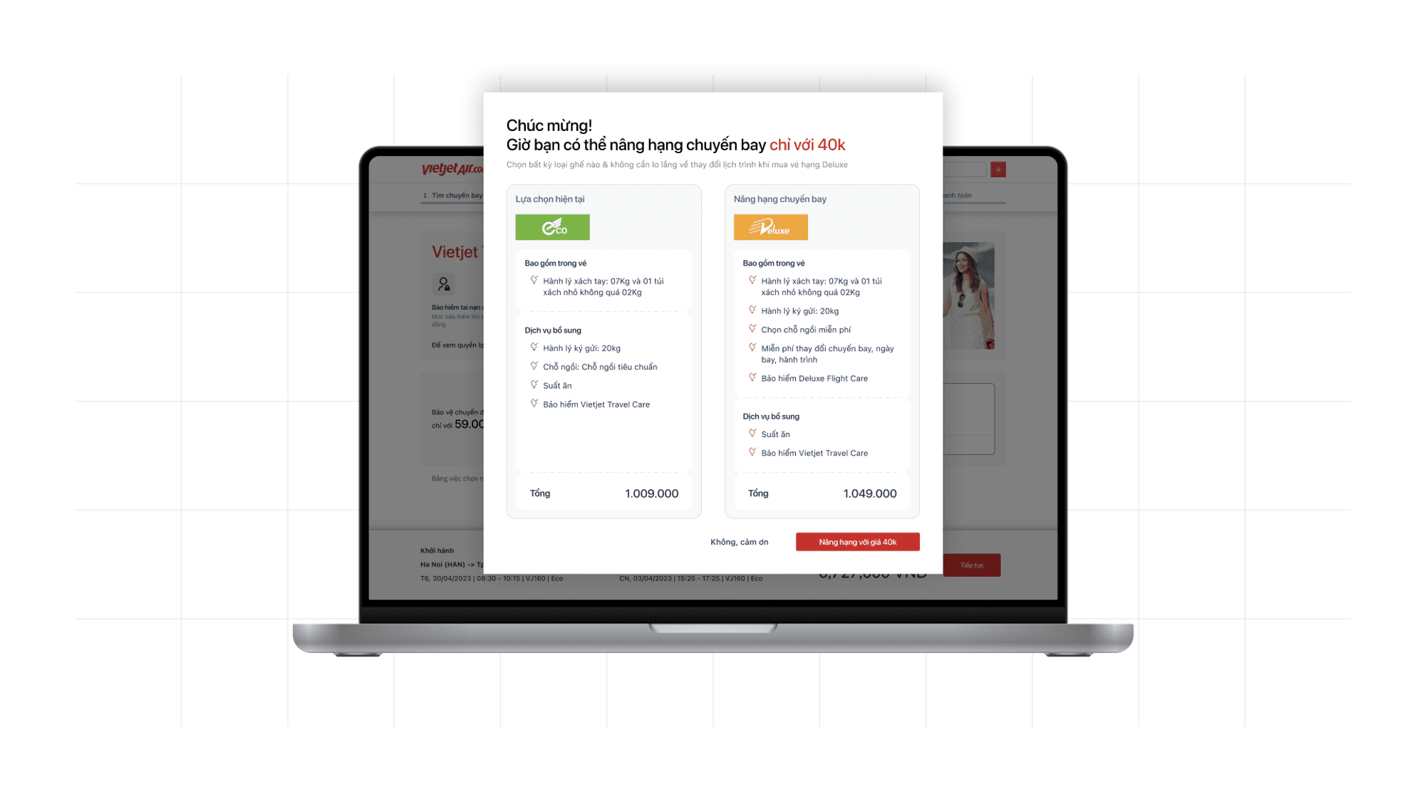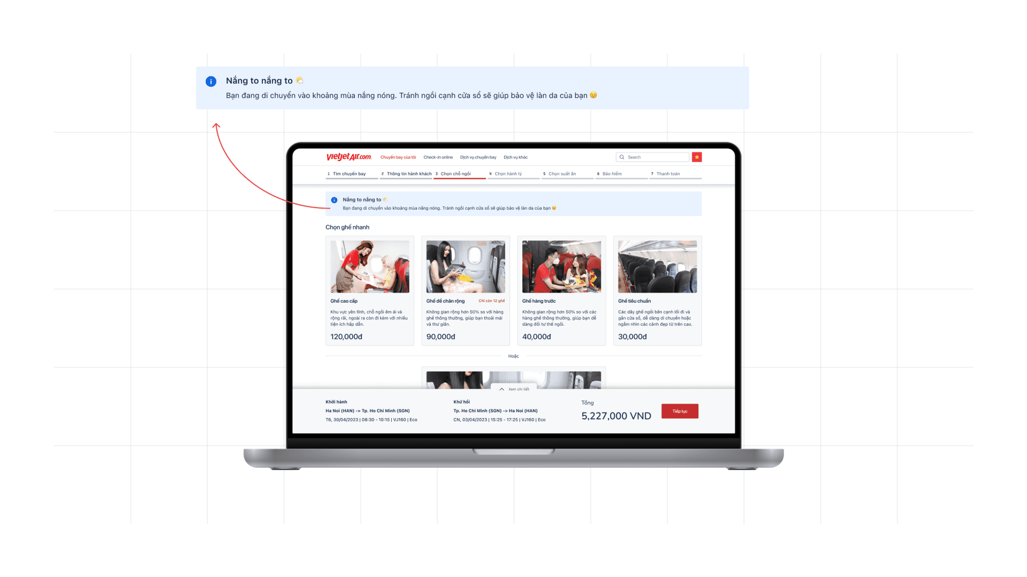 We make a major tweak to the flow, to sell more services, instead of just letting the user choose which service suits them, we walk them through all the service purchase screens of Vietjet Air for promotion opportunities. Of course, we still allow user to Skip through.
